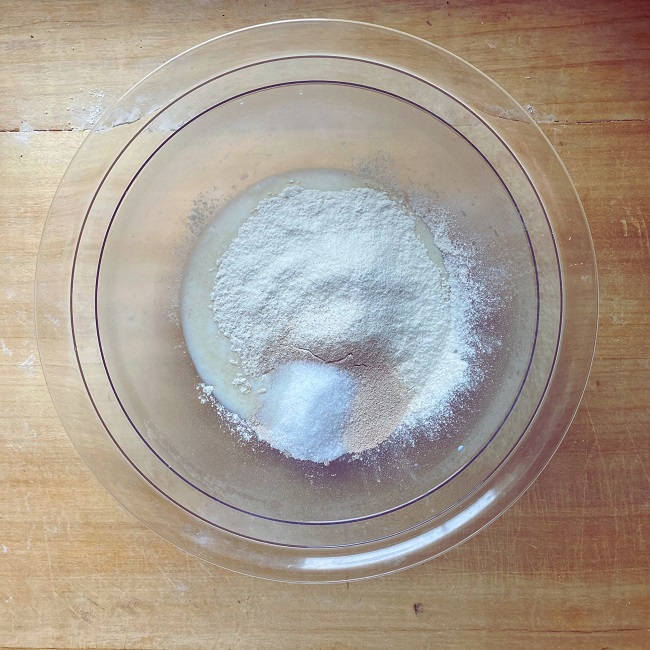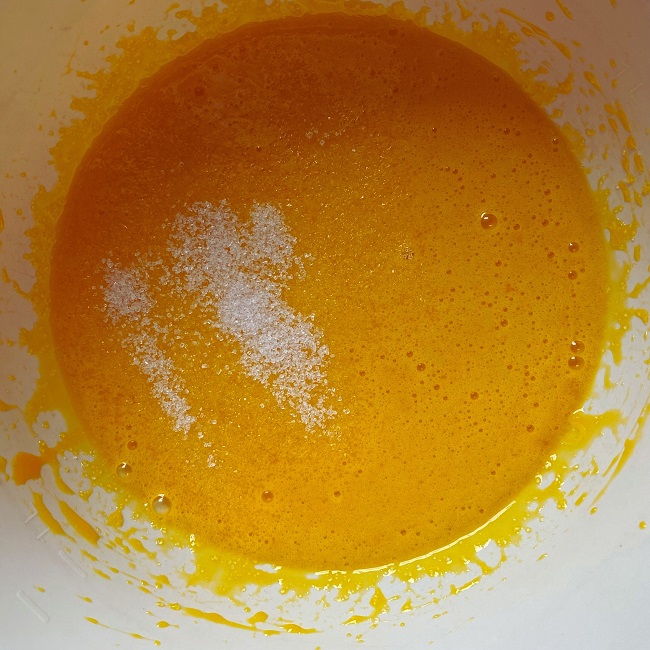 Do dużej miski przesiej 3 łyżki mąki, dodaj drożdże i 3 łyżki cukru, a następnie wlej około 100 ml ciepłego (lecz niegorącego!) mleka. Dokładnie wymieszaj i odstaw zaczyn pod przykryciem w ciepłe miejsce na około 25 minut. Zaczyn urośnie i pięknie się spieni. W tym czasie żółtka utrzyj z cukrem.