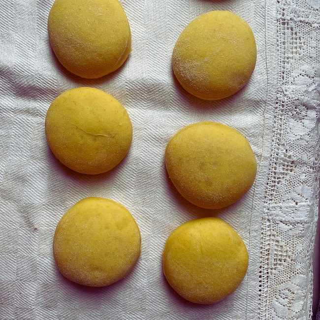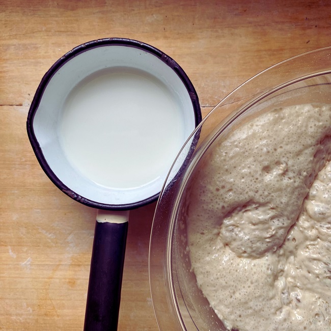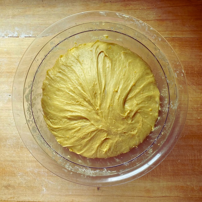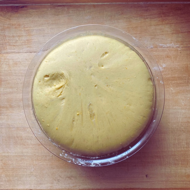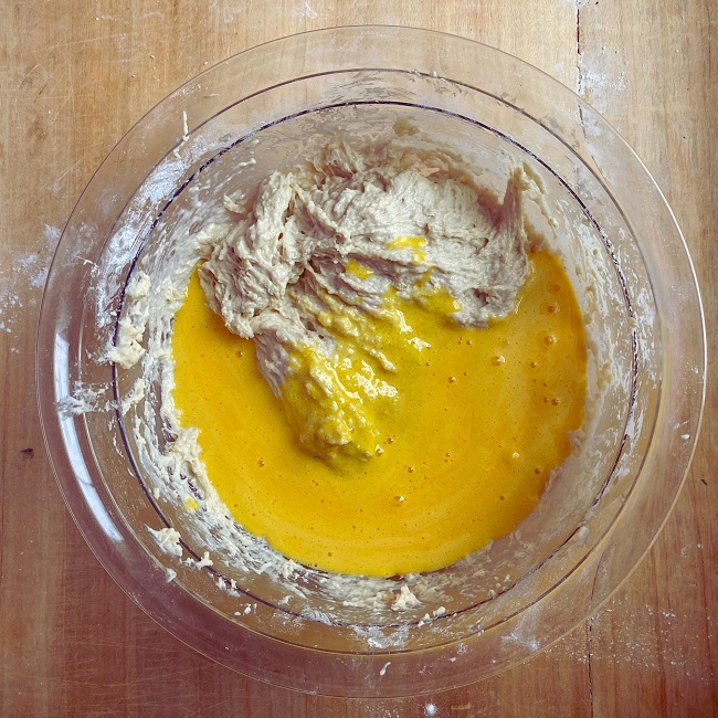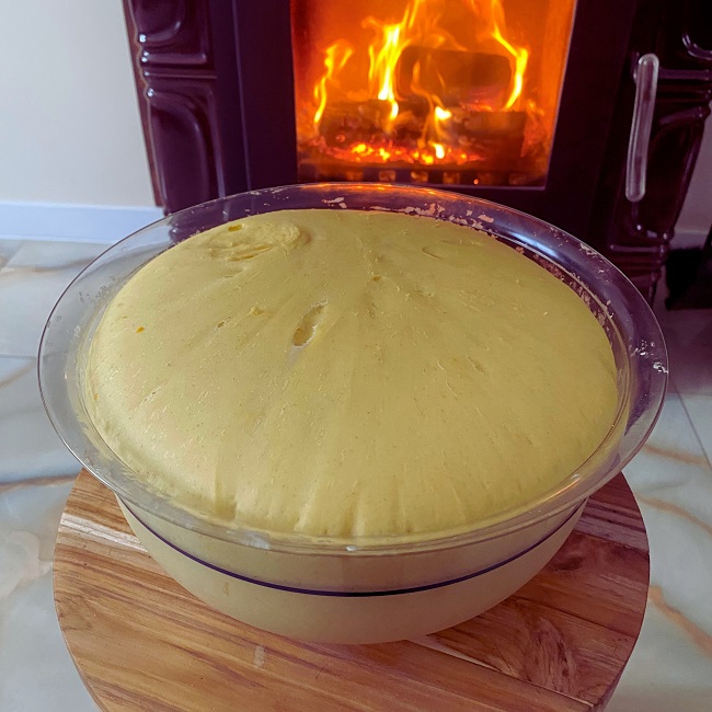 Gdy zaczyn wyrośnie, można dodać pozostałą przesianą mąkę, utarte żółtka oraz skórkę z cytryny. Spokojnie wyrabiaj ciasto, dodając mleko w miarę potrzeby. Po chwili możesz dodać roztopione masło klarowane oraz spirytus. Możesz skorzystać z pomocy robota kuchennego lub wyrabiać ciasto ręcznie – u nas trwało to około 40 minut, aż stało się gładkie, lśniące i zaczęło odchodzić od ręki.