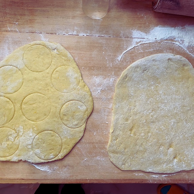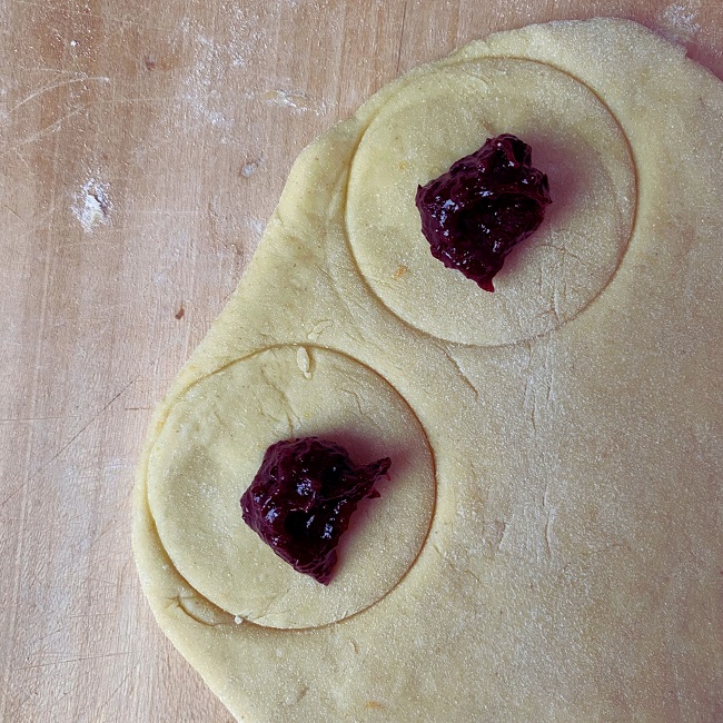 Wyrośnięte ciasto podziel i rozwałkuj na grubość 1,5 cm na podsypanej mąką stolnicy. Większą szklanką (u nas o średnicy 5 cm) zaznacz rozmieszczenie pączków, a pośrodku każdego koła wyłóż pół łyżeczki nadzienia i przykryj drugim rozwałkowanym płatem ciasta. Wyraźnie zobaczysz, gdzie znajduje się nadzienie – tą samą szklanką wykrój pączki. Dzięki tej metodzie brzegi ładnie się zlepią, a powidła nie będą wyciekać. Proces powtarzaj aż do wykorzystania całego ciasta. Pączki odłóż na podsypanej mąką deseczce, przykryj ściereczką i odstaw w ciepłe miejsce na około 30 minut.